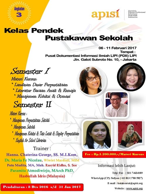 APISI, sebuah lembaga pengembangan kompetensi pustakawan sekolah, akan mengadakan kursus singkat bersertifikat untuk menambah keterampilan pustakawan sekolah dalam pengembangan program perpustakaan di sekolahnya. Melalui kursus ini, para pustakawan sekolah akan diajarkan keterampilan teknis dan konseptual untuk peningkatan kinerja dan perannya sebagai pekerja profesional informasi di sekolah. Peserta yang berminat dapat memilih materi kursus berdasarkan kebutuhannya.