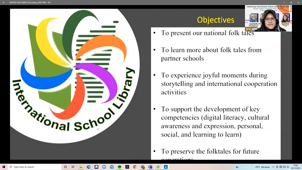 Setelah memanaskan suasana dengan sesi sharing, berikutnya masuklah ke acara inti. Pembicara pertama yang berkesempatan menyampaikan materi nya yaitu Antonija Lujanac yang merupakan pustakawan sekolah dari Osnova Skola Dobrise Cesarica di kota Zagreb, Croatia. Antonija pada kesempatan ini berbagi tentang kegiatan pertukaran video storytelling antar negara yang digagasnya. Dalam materi yang dibawakannya, Antonija menampilkan keseruan situasi ruang kelasnya pada saat siswa-siswi di sekolahnya menyaksikan video cerita rakyat dari Filipina, dan bagaimana siswa-siswi tersebut menyalurkan creative thinking mereka dengan mengambil benang merah dari cerita rakyat tersebut dan mengaplikasikannya ke dalam kehidupan mereka.