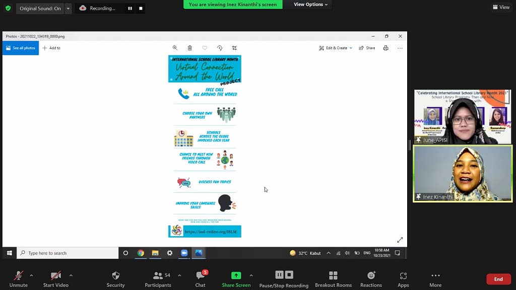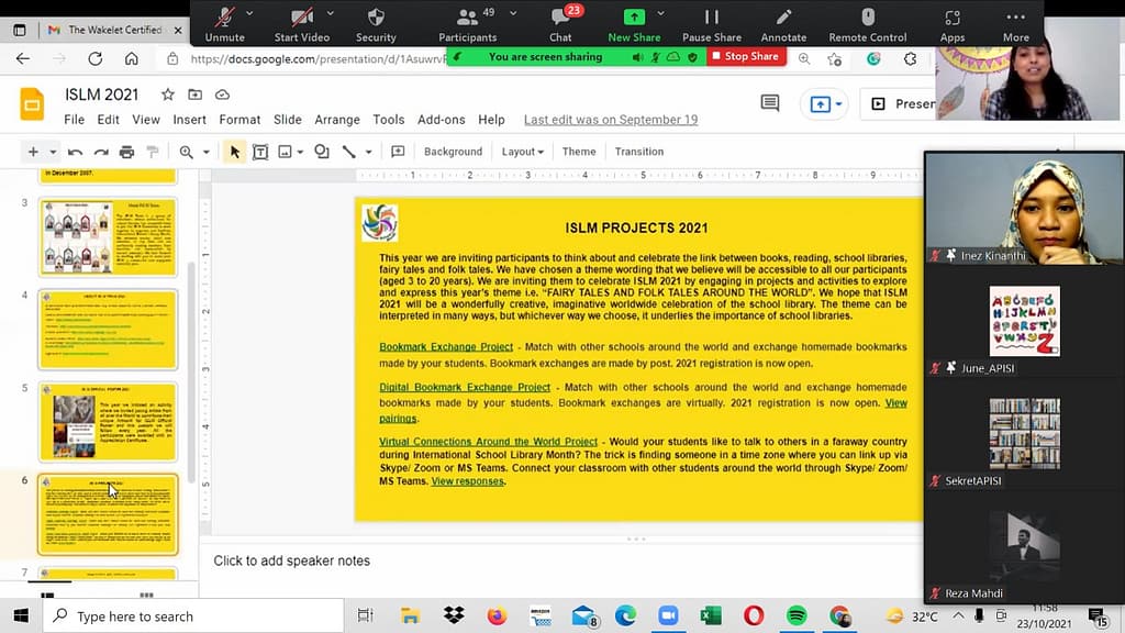Pemateri selanjutnya yaitu Inez Kinanthi, menyampaikan tentang salah satu proyek ISLM yang dapat diikuti peserta selama bulan Oktober ini, yaitu virtual connection around the world. Projek yang digagas tim ISLM ini pada tahun sebelumnya dikenal dengan nama Skype Project, namun seiring dengan keadaan dan perkembangan teknologi terutama melesatnya beberapa aplikasi video conference saat ini, di tahun 2021 Skype Project berganti nama menjadi Virtual Connection Around the World. Sesuai namanya, program ini memungkinkan peserta nya untuk dapat terhubung melalui panggilan video dan kemudian dapat berdiskusi dan bertukar pendapat sesuai topik yang diusung pada tahun berjalan.