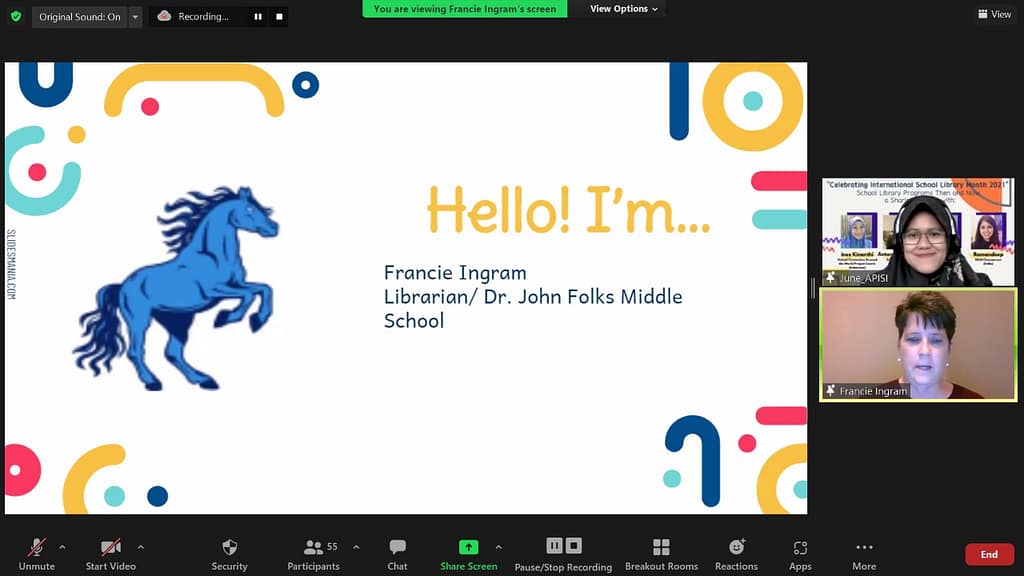 Francie Ingram selaku Bookmark Exchange Project Coordinator adalah pemateri ketiga yang memaparkan bukan hanya tentang program pertukaran pembatas buku yang dikoordinatorinya, namun Francie juga berbagi mengenai berbagai program yang telah dia kerjakan untuk perpustakaan sekolahnya baik sebelum pandemi dan selama pandemi. Francie menunjukan secara detil macam-macam program yang digagasnya dan juga membagi resource yang dapat berguna bagi peserta.
